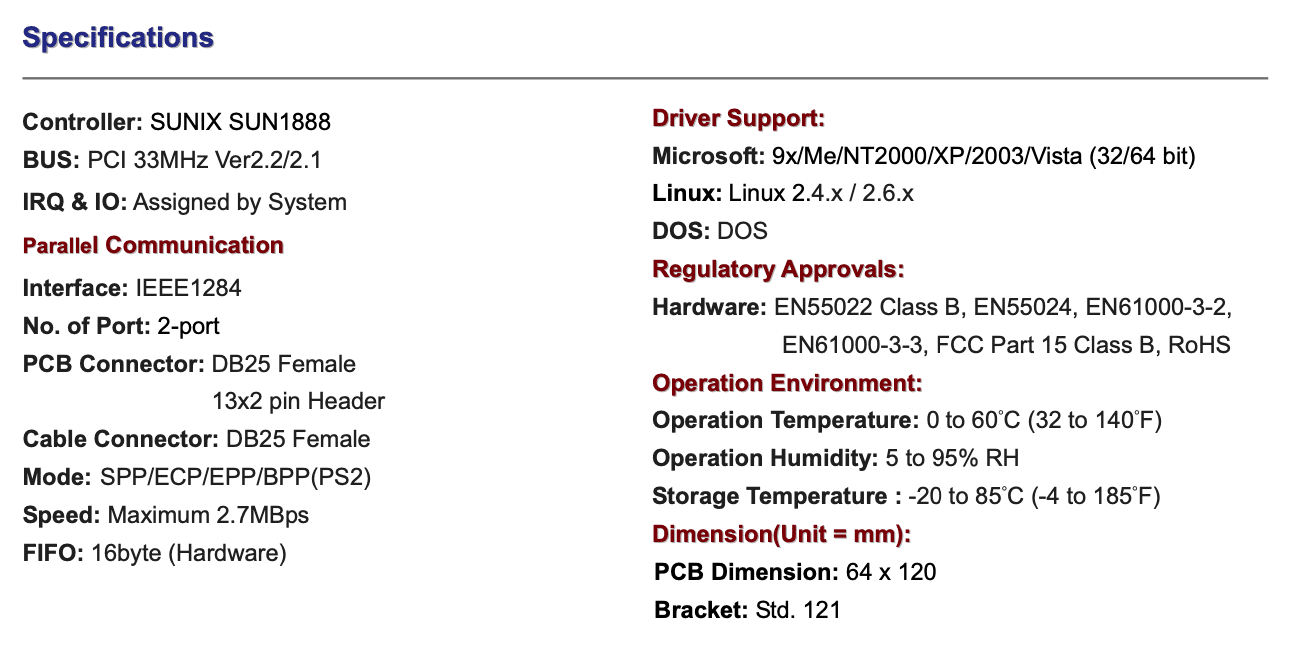 مشخصات کارت PCI-Parallel 2 Port :