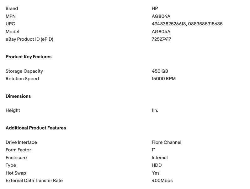هارد دیسک HP AG804A یک هارد با ظرفیت 450 گیگابایت است که از فناوری Fibre Channel برای انتقال داده‌ها استفاده می‌کند. این هارد در فرم فاکتور 3.5 اینچ (LFF) طراحی شده و با سرعت چرخش 15000 دور در دقیقه، عملکردی سریع و قابل اعتماد ارائه می‌دهد. مشخصات اصلی این هارد به شرح زیر است: