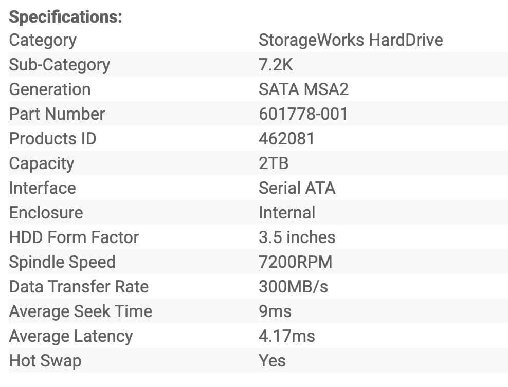HP MSA2 AW556A 2TB SATA 3G برای ذخیره‌سازی اطلاعات استفاده می‌شود و بیشتر در آرایه های تحت شبکه (SAN) با استفاده از RAID مورد استفاده قرار گیرد.